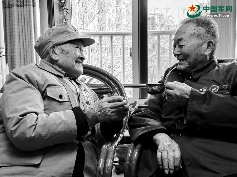 在家人的陪伴下,何伯超辗转2000余公里,从四川泸州来到山东烟台,终于见到了96岁的老班长高万功。他们相互搀扶着,有说不完的话,谈话间仿佛又回到炮火连天的战斗岁月。