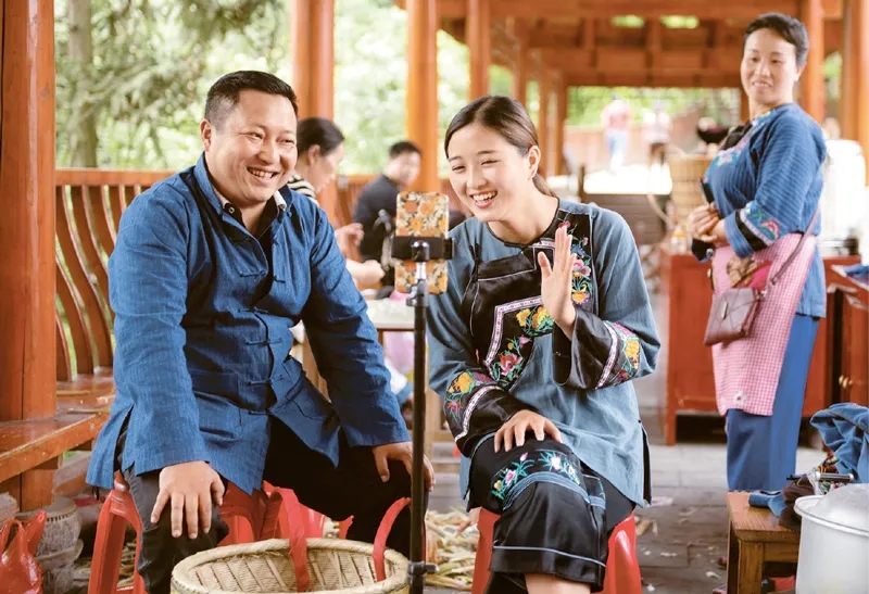 图为2020年5月15日,湖南省十八洞村第三任驻村扶贫工作队队长麻辉煌(左)与返乡大学生施林娇一起通过网络直播推销土特产。新华社发 陈思汗/摄