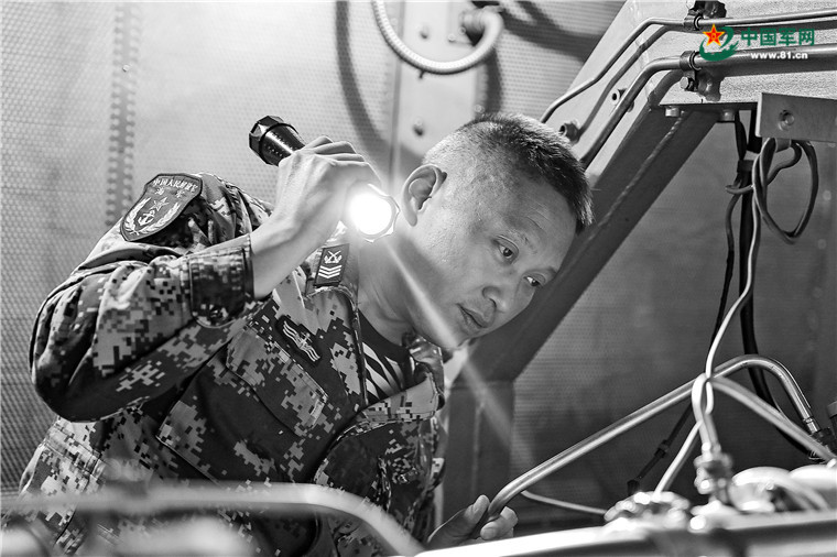 这样的面孔,几乎长在每一名老机电兵脸上。进入机舱,马正江用力擤了擤鼻子。充斥着机油味的空气有点刺鼻,马正江却说:“这个味才对,才让人安心。”