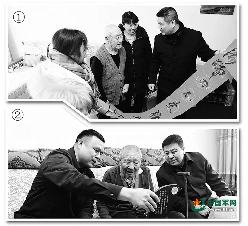 ①慰问小组给老兵韩井全赠送春联。