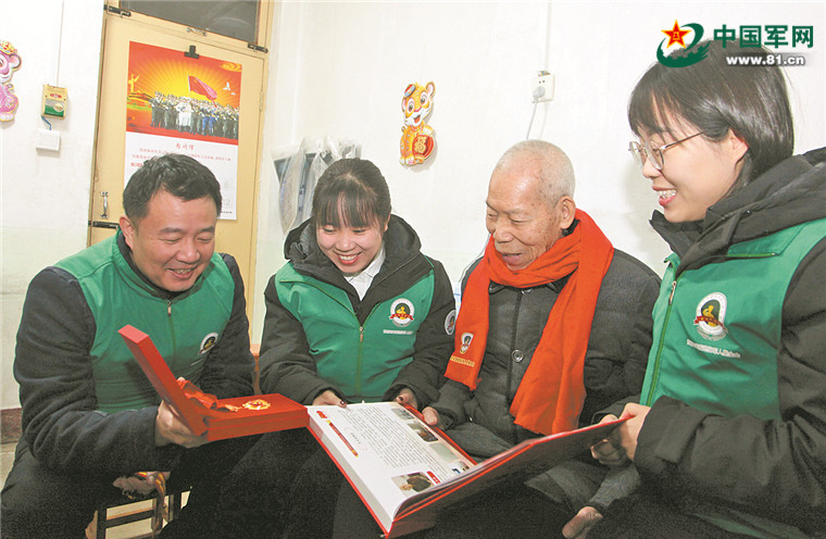 春节到来之际,山东省济南市军队离休退休干部第四休养所离休干部韦玉成,迎来几位穿着绿马夹的志愿者。他们马夹上的徽章,印有“济南市关爱退役军人基金会”字样。90后志愿者刘俊英和92岁的韦玉成一见面,就热情地打招呼:“韦爷爷,我们来给您拜年啦!”