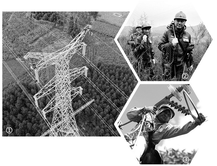 图①:输电铁塔上,龙福刚带领班组成员进行高空作业。