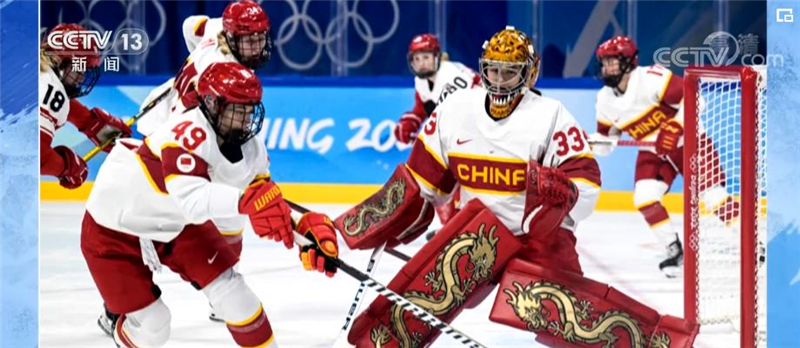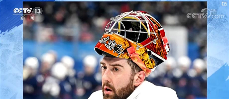 中国男子冰球队首秀,守门球员史密斯的头盔有京剧脸谱、兵马俑、龙腾还有中国长城,下方用中文写着自己的名字。