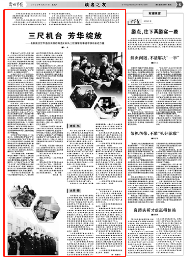历经岁月洗礼,报纸微微泛黄,但报纸中央的一则消息依旧醒目,刊载了话务连前身部队——原沈阳军区空军某团电话连的3位女战士“编写出一部话务员训练教材”的事迹。
