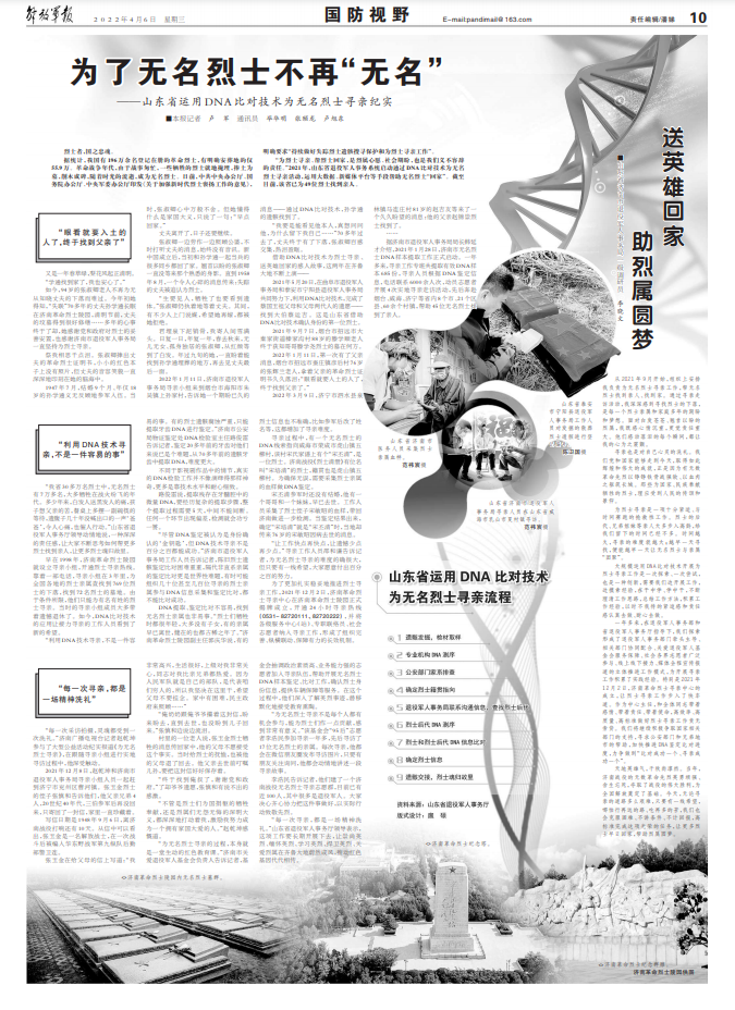 一年多来,在退役军人事务部和省退役军人事务厅指导下,我们探索形成了退役军人事务部门牵头主导、相关部门协同配合、关爱退役军人基金会服务保障、社会各界志愿者广泛参与、线上线下接力、媒体全程宣传报道的立体推进工作模式,为开展寻亲工作积累了实践经验。特别是2021年12月2日,济南革命烈士寻亲中心的成立,让烈士寻亲工作步入了快车道。作为中心主任,和全体同志带着感情、带着责任、带着使命,高效率、高质量、高标准做好烈士寻亲工作责无旁贷。我们将继续积极争取国家相关部门的支持,寻求公安部门和兄弟地市的帮助,加快推进DNA鉴定比对进度,力争做到“比对成功一个、寻亲成功一个”。