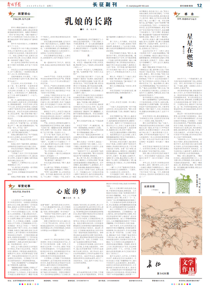 夜幕降临,父亲闻讯赶来了。得知是军医救了儿子的命后,不善言词的他不知道怎么感谢军医好了,嘴里不住地说着“谢谢”。离开部队农场卫生所时,一个念头像道强烈的闪电,在王吉刚的脑海里闪亮了一下。他大声对军医说道:“叔叔,我将来也跟你一样当军医!”