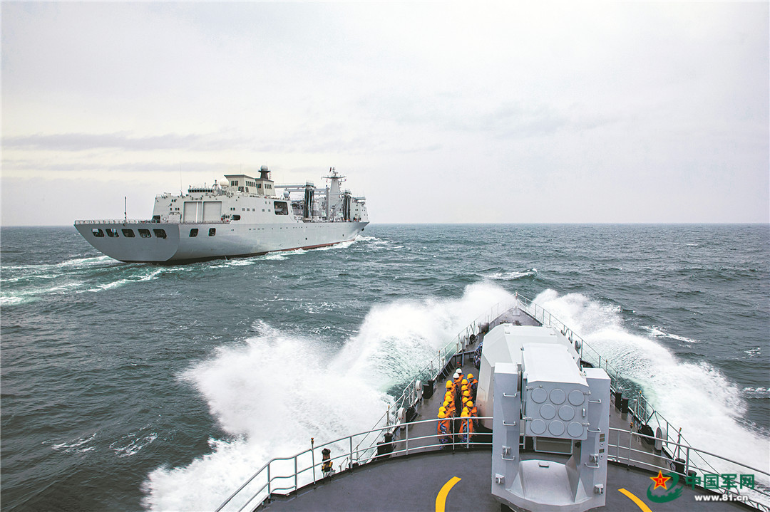 海面威胁解除,编队又展开航行补给训练。此时,海况更加恶劣,舰艇在波峰浪谷间摇摆起伏。官兵们克服困难,齐心协力投入训练。