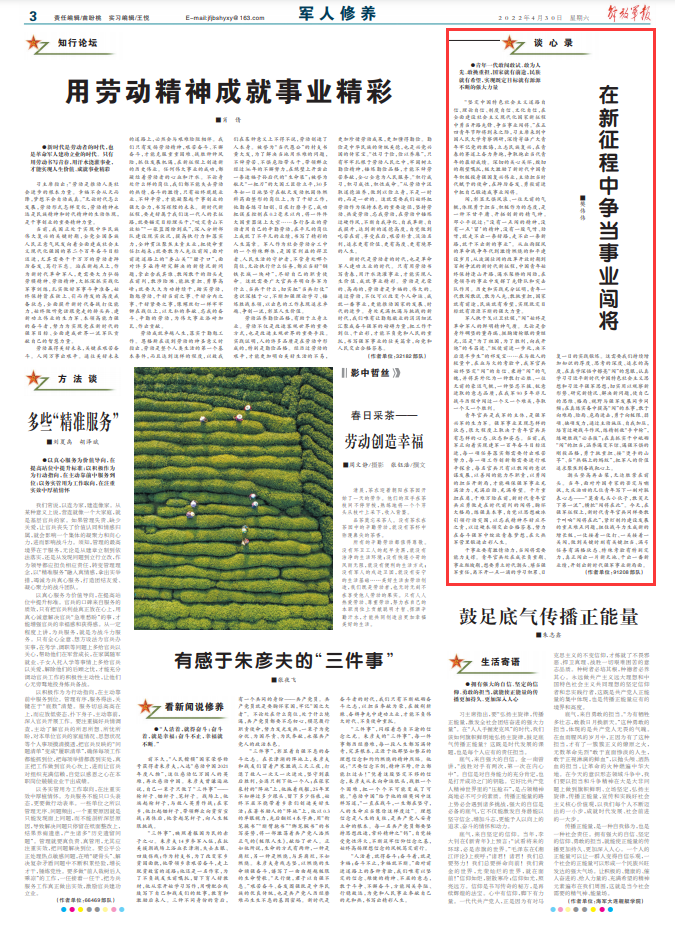 青年官兵是我军的主体,是强军兴军的生力军。强军事业呈现怎样的状态,很大程度上取决于青年官兵具有怎样的心态、状态和姿态。当前,我军正向着实现建军一百年奋斗目标迈进,每一项任务落实都需要付出艰苦努力,每一项工作创新都需要进行艰辛探索,每名官兵只有以敢闯的意识谋发展,以善闯的能力尽职责,以勇闯的担当开新局,才能确保强军事业充满活力、充满后劲、充满希望。千斤重担在肩,千难万险在前,新时代青年官兵应勇做走在时代前列的闯将,胸怀大格局,练强真本事,自觉以思想破冰引领行动突围,以忘我精神尽好应尽之责,以过硬本领交出合格答卷,努力在奋斗强军中绽放青春梦想,在火热军营里锻造出彩人生。