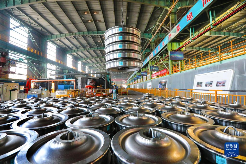 3月3日,在中国宝武马钢一车轮生产车间,成品车轮在吊装准备发货。新华社发