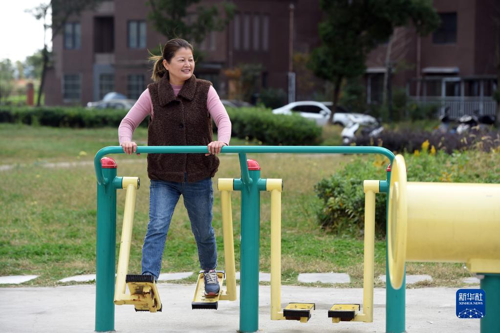 安徽省马鞍山市薛家洼的上岸渔民陈兰香在新家所在的小区里锻炼(2020年10月31日摄)。新华社记者 周牧 摄