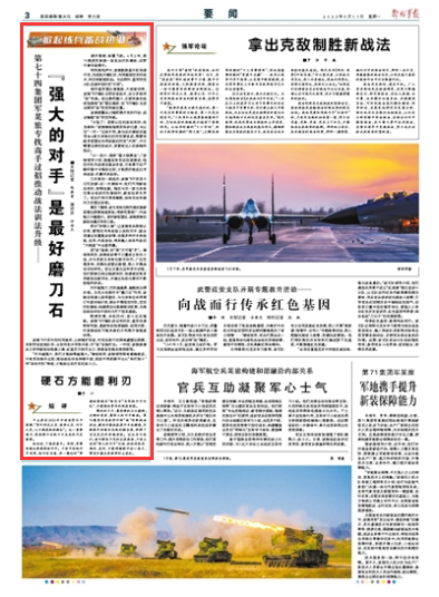 锋利的刀刃,靠坚硬的石头磨砺;过硬的素质,靠强大的对手锻造。第74集团军某旅紧盯强“敌”创新战法训法,瞄准问题短板展开专攻精练,不断提升训练和实战的耦合度,取得了实实在在的训练质效。这也启示我们,面对瞬息万变的未来战场,只有主动找“强大的对手”过招,积极设险局、难局、危局,才能持续提升核心战力,掌控打赢未来战争的主动权。
