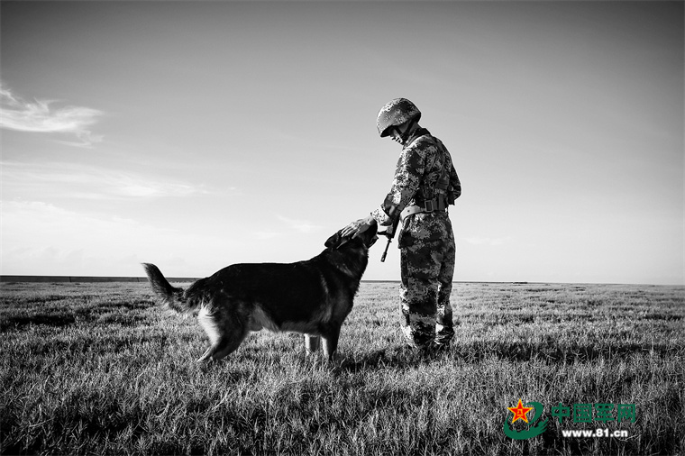 训练结束,一名战士带着军犬在永暑礁草坪休息。