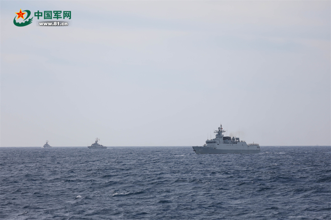 完成联合搜救演练后,编队运动演练开始。按照计划,参演的4艘舰艇依次组成单纵队、单横队和双纵队等队形。期间,双方舰艇沟通顺畅、协同高效。