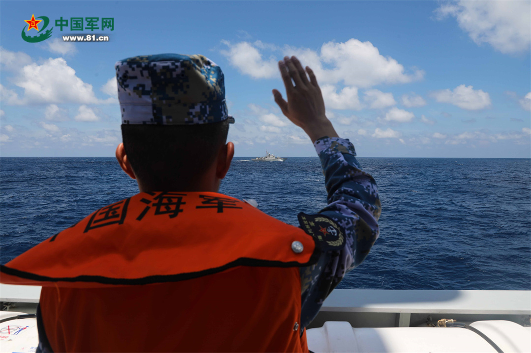 6月23日,参加中越北部湾第32次联合巡逻的中方舰艇官兵向越方挥手告别。 张彬 摄