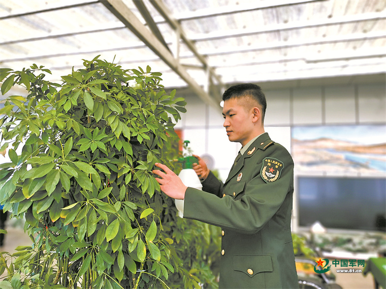 张艳锋休假期间,列兵费腾主动承担起浇树任务。