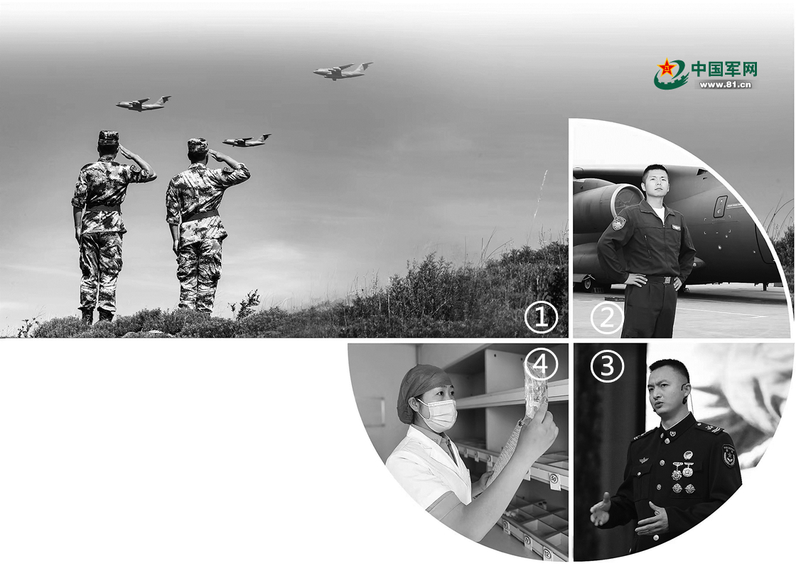 图①:西部战区空军某场站警卫战士向战机敬礼。陈路东摄 图②:冯玮与运-20合影。刘 书摄 图③:蒲帮明在讲台上分享他的故事。刘卓超摄 图④:杨宗雪进行配药检查。宋郑生摄 制图:扈 硕