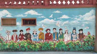 △当地的文化墙绘上,专门呈现了新城西门村和十八洞村元素。(总台记者曹江拍摄)