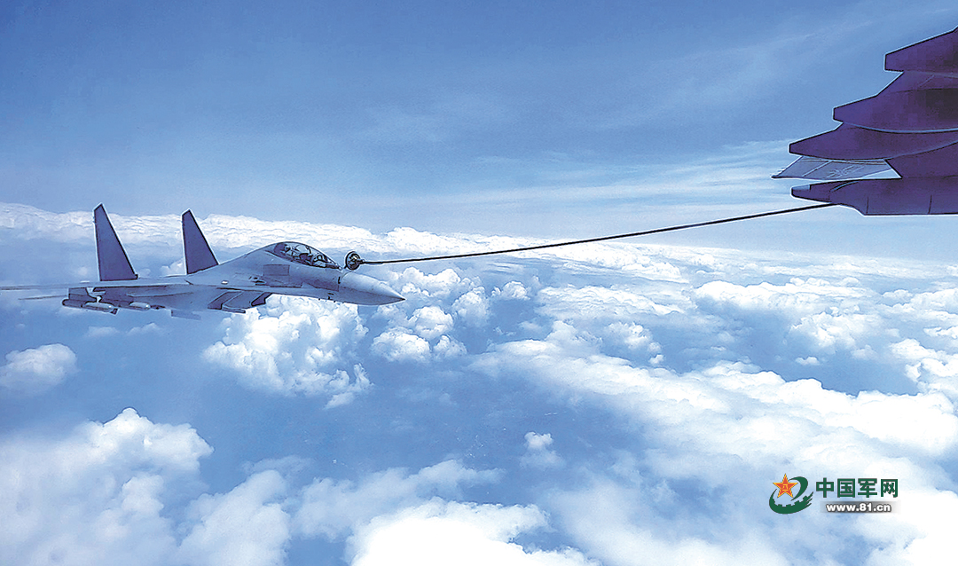 空军运油-20和歼-16飞机开展海上方向空中加油训练。作者提供