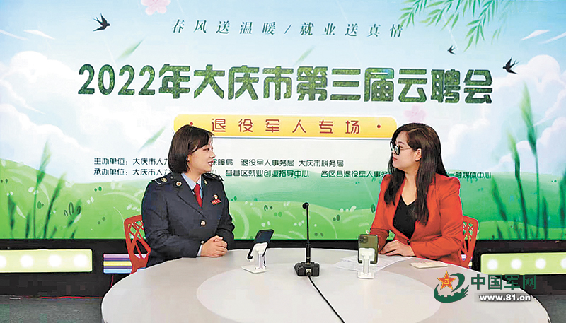 刘红丽(左一)在“2022年大庆市第三届云聘会”退役军人专场,解读相关税收政策。张万东摄