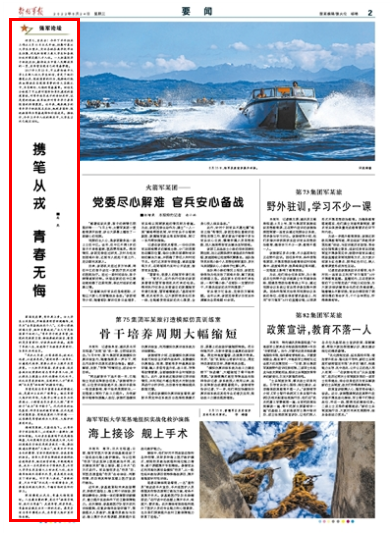 敢有携笔从戎志,青春无悔报国时。人生最自豪的事,莫过于“祖国召唤时,我们正青春”!走进军营,投身军旅,青春就会焕发出不一样的光彩。愿更多有志青年携笔从戎,在军营大熔炉里淬炼成钢。
