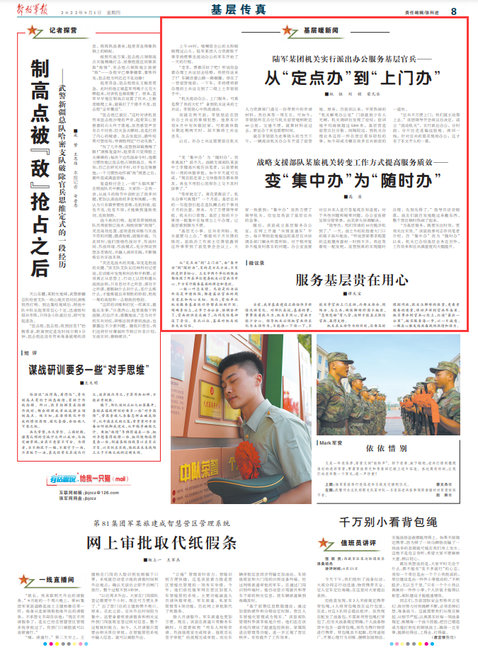从“定点办”到“上门办”,由“集中办”到“随时办”,变的是方式方法,不变的是职责初心。上文中两个单位的做法都体现了所在单位党委机关以官兵为中心、千方百计服务基层的理念和意识。