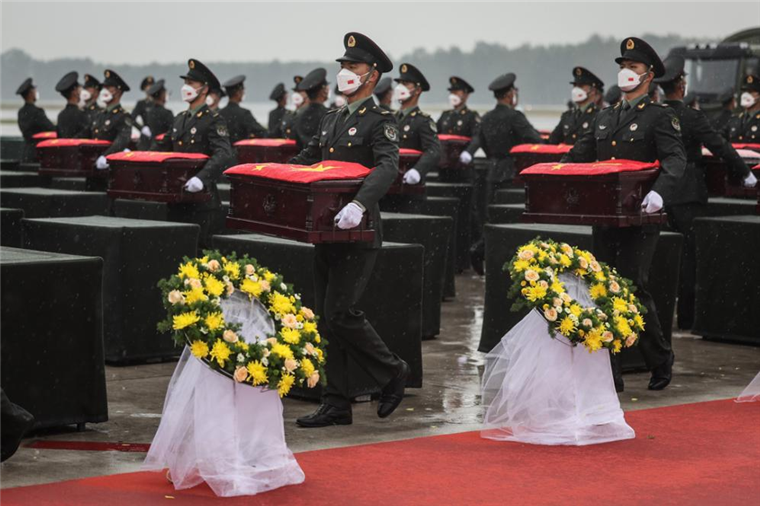 9月16日,在沈阳桃仙国际机场,礼兵将殓放志愿军烈士遗骸的棺椁护送至运送车辆。新华社 发