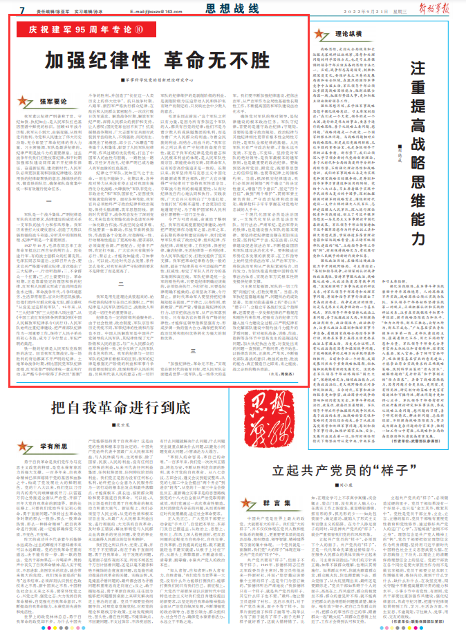 我军素以纪律严明著称于世。守纪如铁、执纪如山,是人民军队红色基因图谱中鲜亮的标识。回顾95年战斗历程,我军从小到大、由弱变强,从胜利走向胜利,为党和人民建立了伟大历史功勋,充分彰显了革命纪律的伟大力量。习主席强调,军队是最讲纪律的,纪律严明是战斗力的重要源泉。过去战争年代我们打胜仗靠纪律,和平时期加强部队建设同样离不开纪律作保证。奋进新征程,建功新时代,人民军队必须更加重视和加强纪律建设,坚持用铁的纪律凝聚铁的意志、锤炼铁的作风、锻造铁的队伍,确保部队高度集中统一和有效履行使命任务。