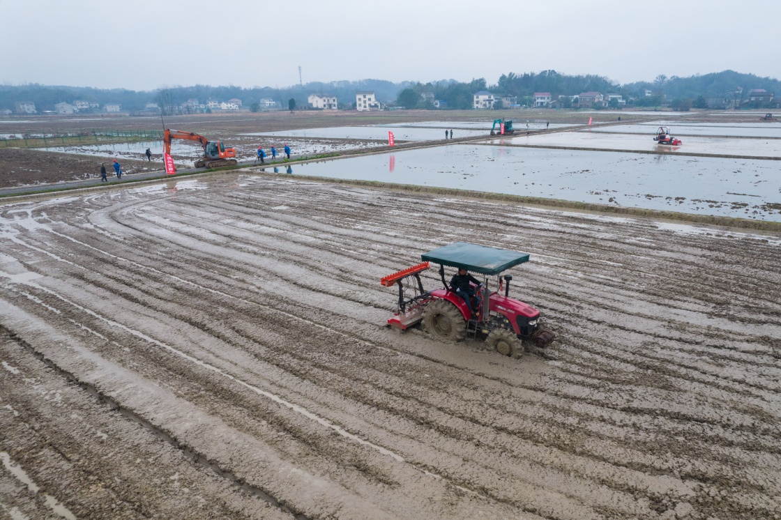 在湖南省常德市桃源县浔阳街道大平村,工作人员驾驶农机平整土地(2022年2月17日摄,无人机照片)。新华社记者 陈思汗 摄