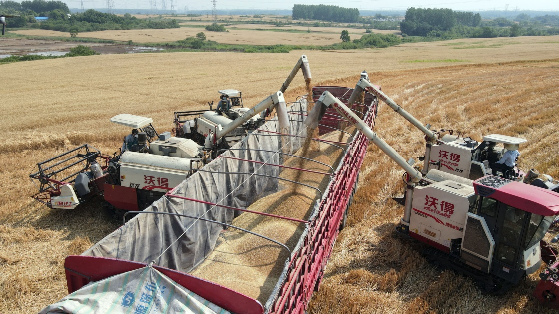 在安徽省合肥市蜀山区小庙镇段冲村麦田里,收割机将小麦装车(2022年5月25日摄,无人机照片)。新华社记者 周牧 摄