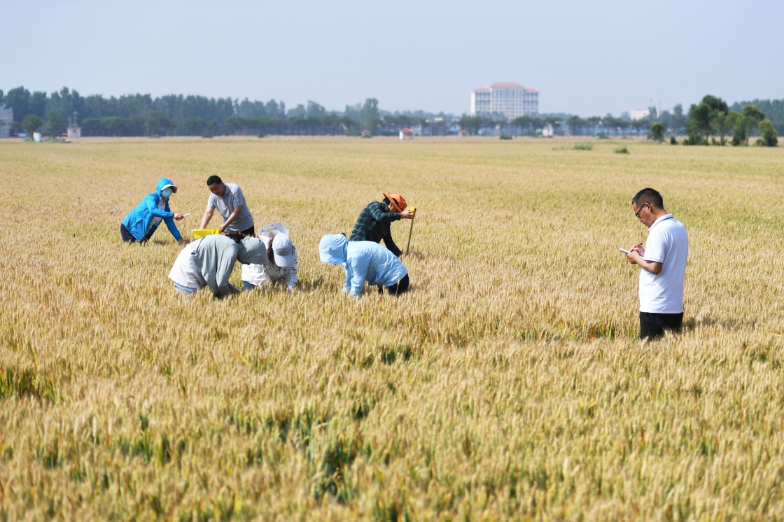 在河南省邓州市腰店镇夏楼村,农技人员在麦田内进行小麦测产(2022年5月24日摄)。新华社记者 张浩然 摄