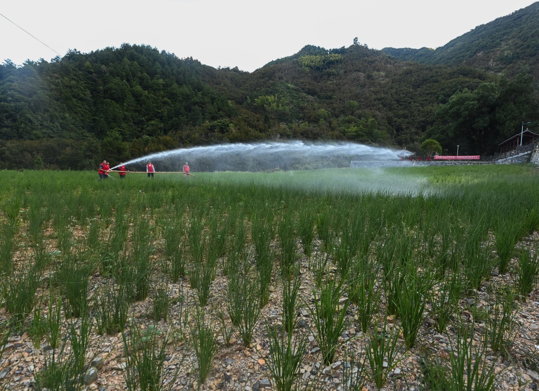 在浙江省淳安县屏门乡金陵村徐家庄自然村的高山生态旱稻田内,党员志愿者在浇灌受干旱影响较为严重的稻田(2022年8月21日摄)。新华社记者 徐昱 摄