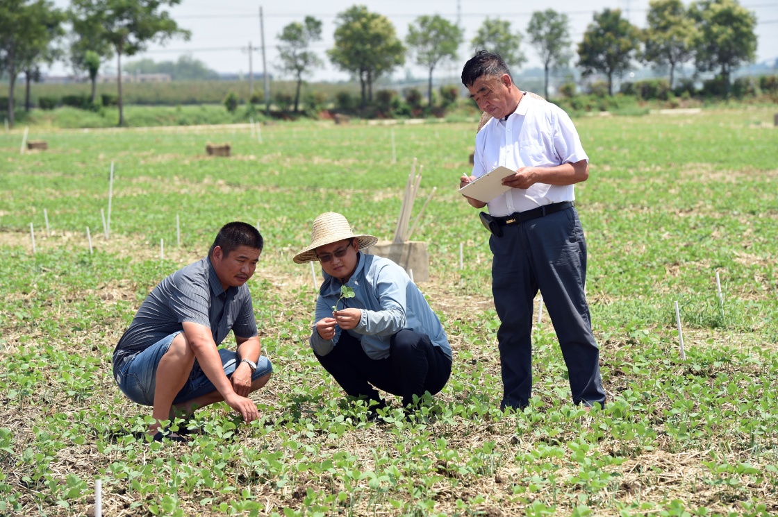在安徽太和县淙祥现代农业种植专业合作社的高产攻关示范田里,徐淙祥(右)和儿子徐健(左)、孙子徐旭东在查看新品种大豆的出苗情况(2022年6月28日摄)。新华社记者 周牧 摄