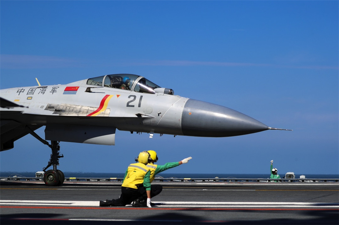 辽宁舰起飞助理放飞歼-15舰载战斗机(2021年9月15日摄)。新华社发(白杨 摄)