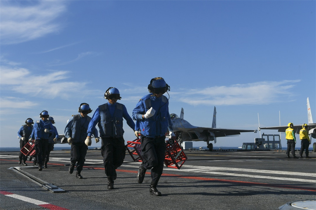 辽宁舰官兵进行舰载战斗机起降甲板保障(2021年7月26日摄)。新华社发(汪良伟 摄)