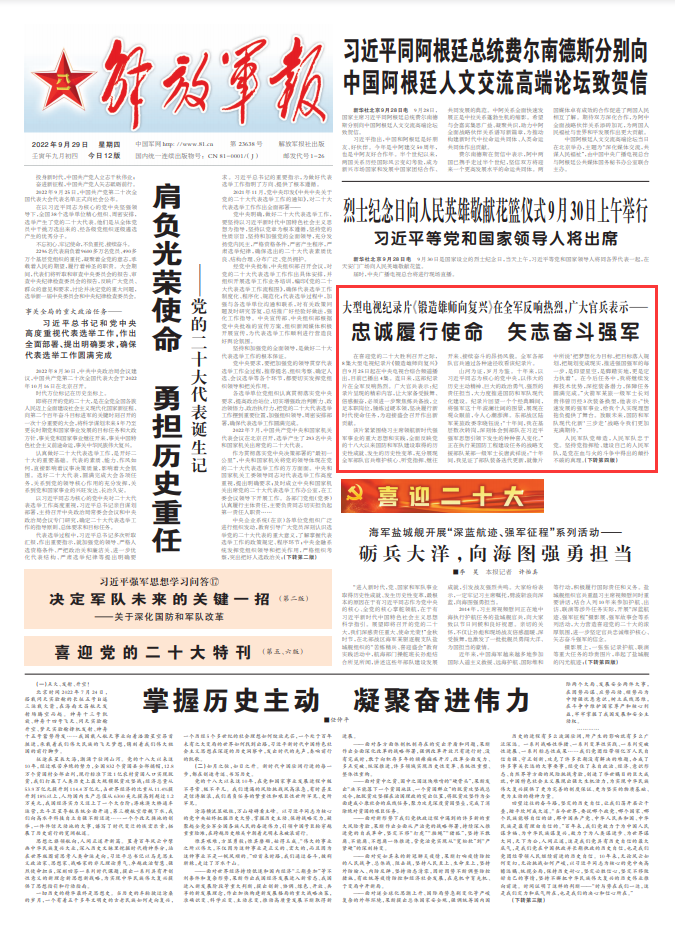 在喜迎党的二十大胜利召开之际,8集大型电视纪录片《锻造雄师向复兴》自9月25日起在中央电视台综合频道播出,目前已播出4集。连日来,这部纪录片在全军反响热烈。广大官兵表示:纪录片呈现的精彩内容,让大家备受鼓舞、倍感振奋,必须进一步聚焦练兵备战,立足本职岗位,锤炼过硬本领,坚决履行新时代使命任务,为迎接盛会召开作出新贡献。