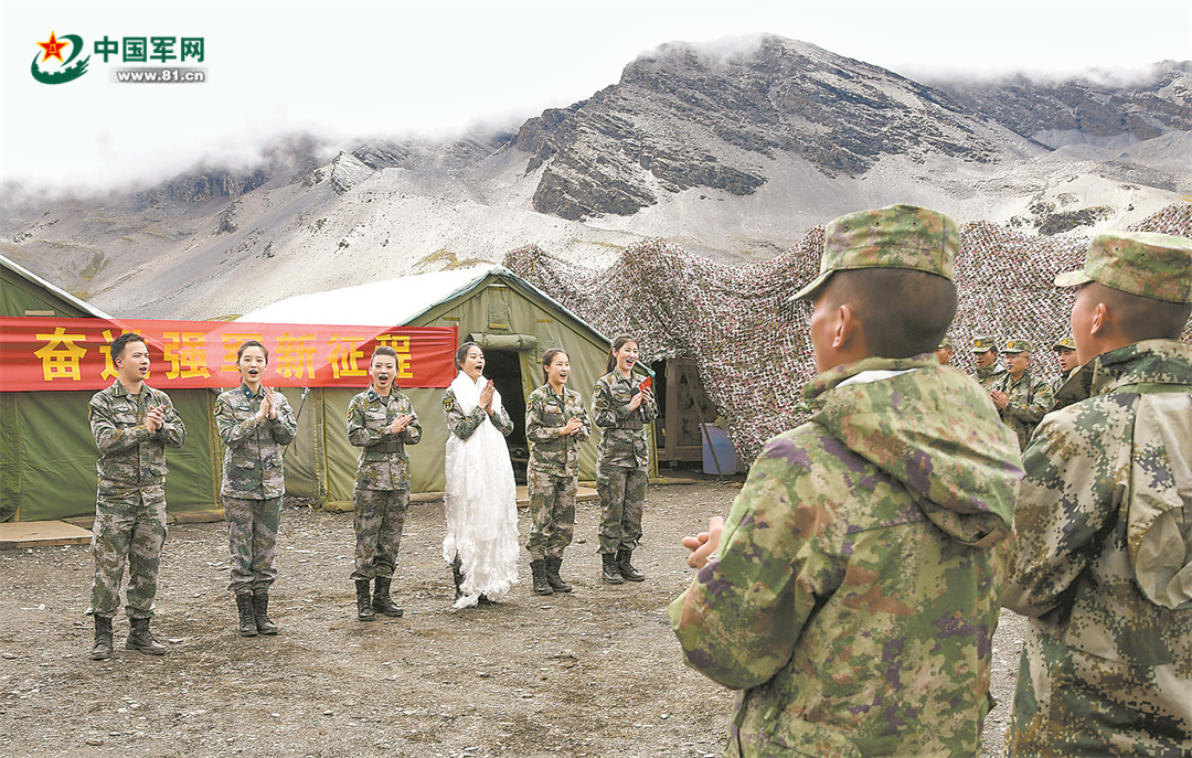 在党的二十大召开前夕,国防大学军事文化学院组织边防行小分队,赴西藏边防一线和驻训点位开展慰问演出,真情服务边防官兵。图为队员们在海拔4800米的某点位上,与官兵共同唱响《强军战歌》。王晨光 摄