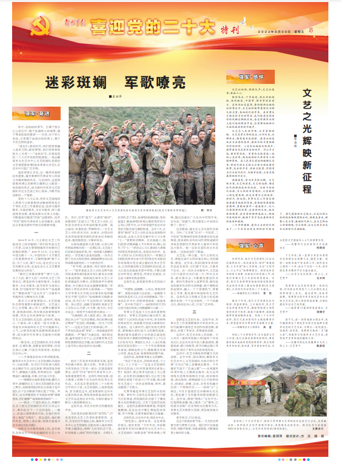 党的二十大即将召开,作为基层文艺工作者,我们充满欢喜期待的同时,要把服务练兵备战的思想树得更牢,努力创演更多兵味浓、战味重、官兵喜欢的作品,充分发挥文艺提振兵心士气的重要作用。