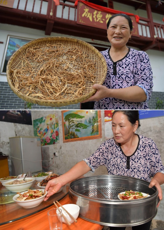 拼版照片:上图为江西省井冈山市神山村村民彭夏英在自己开办的农家乐内展示她家自制的当地特产;下图为彭夏英在农家乐内给顾客上菜(2020年7月15日摄)。新华社记者 彭昭之 摄