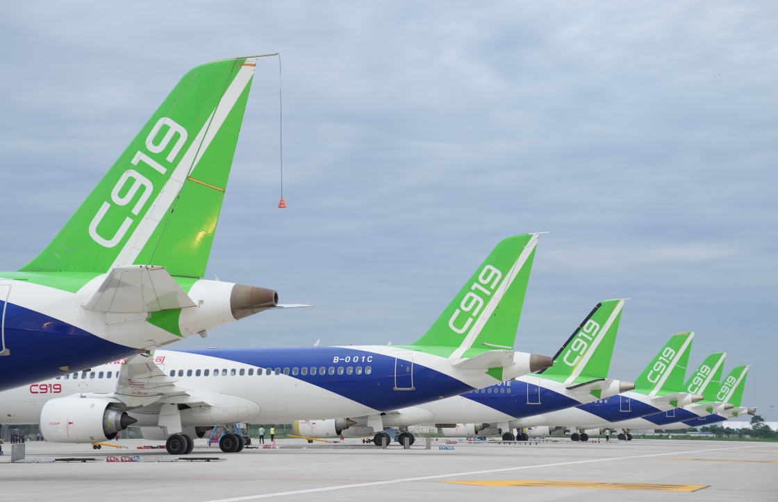 在陕西省蒲城县拍摄的C919大型客机的试飞机(2022年7月18日摄)。新华社记者 丁汀 摄