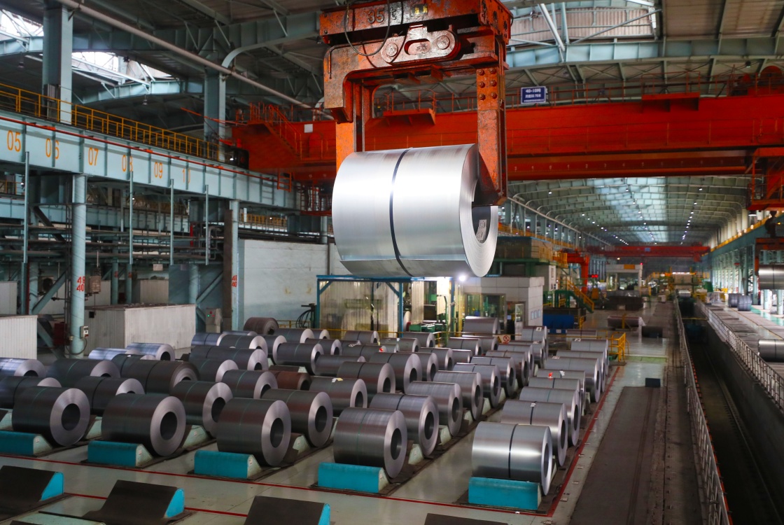 在辽宁本钢冷轧厂,吊车在吊装钢卷(2021年8月18日摄)。新华社记者 杨青 摄