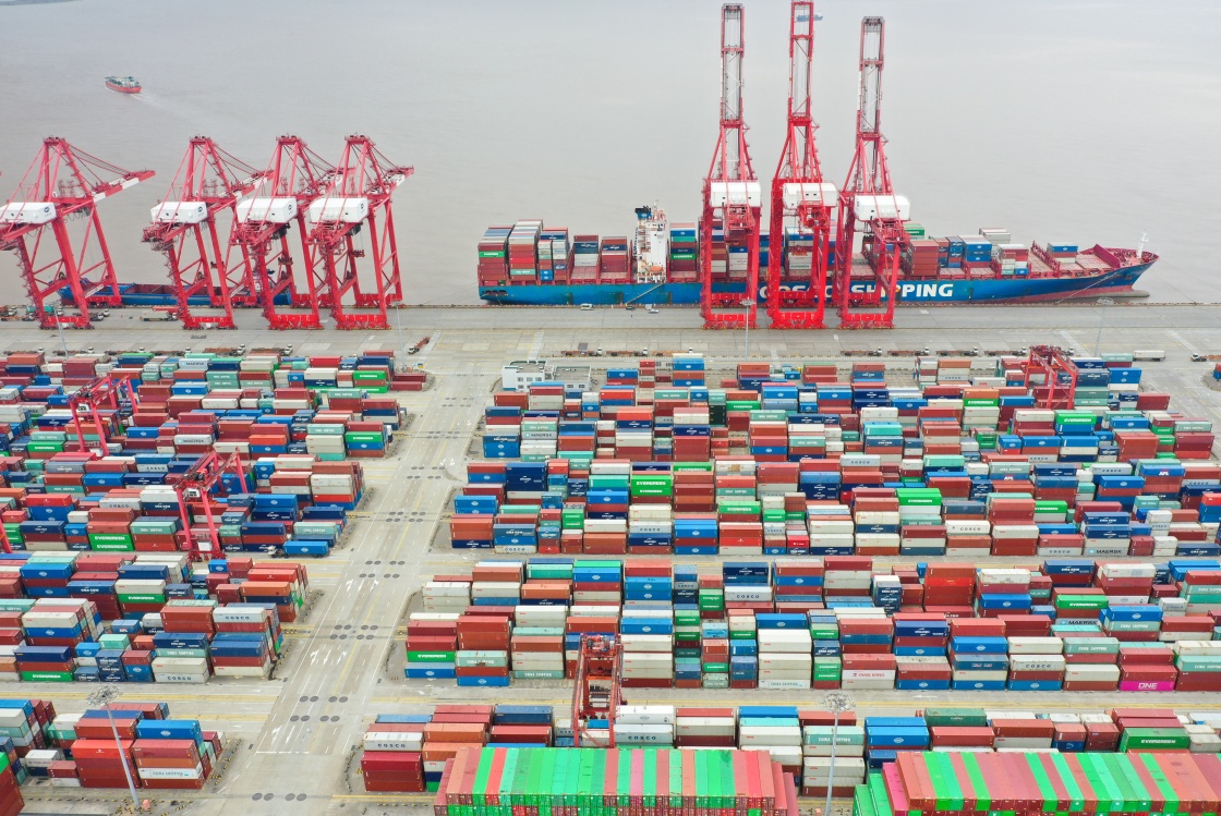 上海洋山港集装箱码头(2022年4月15日摄,无人机照片)。新华社记者 丁汀 摄