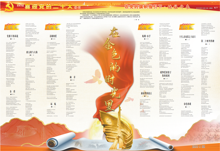 在欢庆党的二十大开幕的日子里,诗人们以饱满的激情、真挚的语言,表达对党的深情、对伟大成就的赞颂、对盛会召开的喜悦之情。在金色的时光里,这些源于生活、发自肺腑、意蕴深长的诗行,闪耀着金子般的色泽,谱成了一曲曲铿锵有力、昂扬奋进的动人乐章。