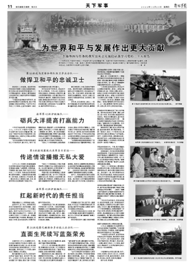 护航编队在亚丁湾上留下的一道道航迹,不仅见证了中国海军拥抱世界、传递友谊、维护和平的真诚,也展现了新时代中国军队的责任担当。