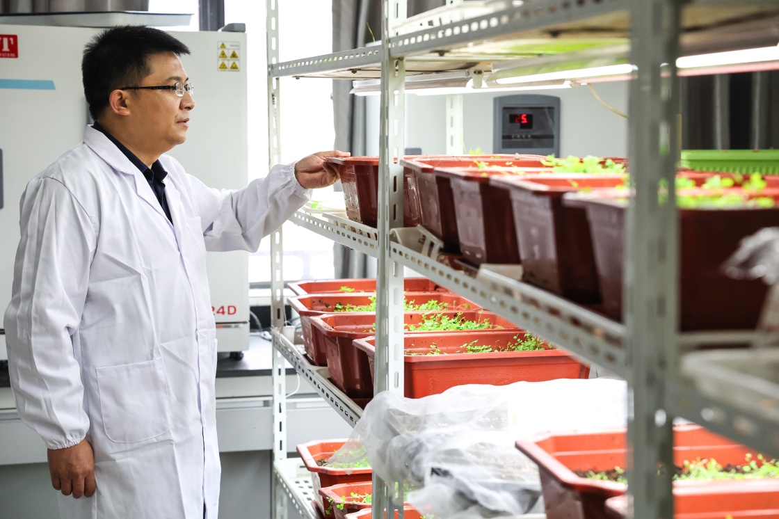 10月20日,贵州大学动物科学学院院长陈超在实验室内观察新品种牧草的生长情况。新华社记者 欧东衢 摄