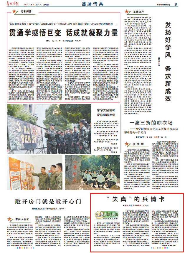 “武班长,兵情卡不仅要用笔去记录,更要走心才行。”临走前,指导员语重心长的一席话,说得我脸上火辣辣的。我在随后的观察中发现,小王的表现确实与他填写的兵情卡内容大相径庭。与小王相似,班里其他新战士大多没有在兵情卡上填写实情,“报喜不报忧”的居多。