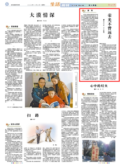 如今,奶奶离世很多年了,但她的谆谆教诲犹在我的耳畔。那天,听说我侄子打算大学毕业后参军入伍,我感到非常欣慰,相信这些孩子会将老一辈忠诚勇敢、艰苦奋斗的精神,一代代传下去。