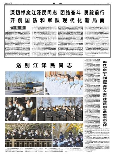 2022年11月30日,我们敬爱的江泽民同志患白血病合并多脏器功能衰竭,抢救无效在上海逝世。江泽民同志的逝世,对我党我军我国各族人民是不可估量的损失。党中央号召,全党全军全国各族人民化悲痛为力量,继承江泽民同志的遗志,以实际行动表达我们的悼念。全军部队满怀敬意和深情,深切悼念江泽民同志,缅怀江泽民同志的光辉业绩,颂扬江泽民同志的伟大情操和崇高品质,加强练兵备战,忠诚履行使命。