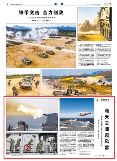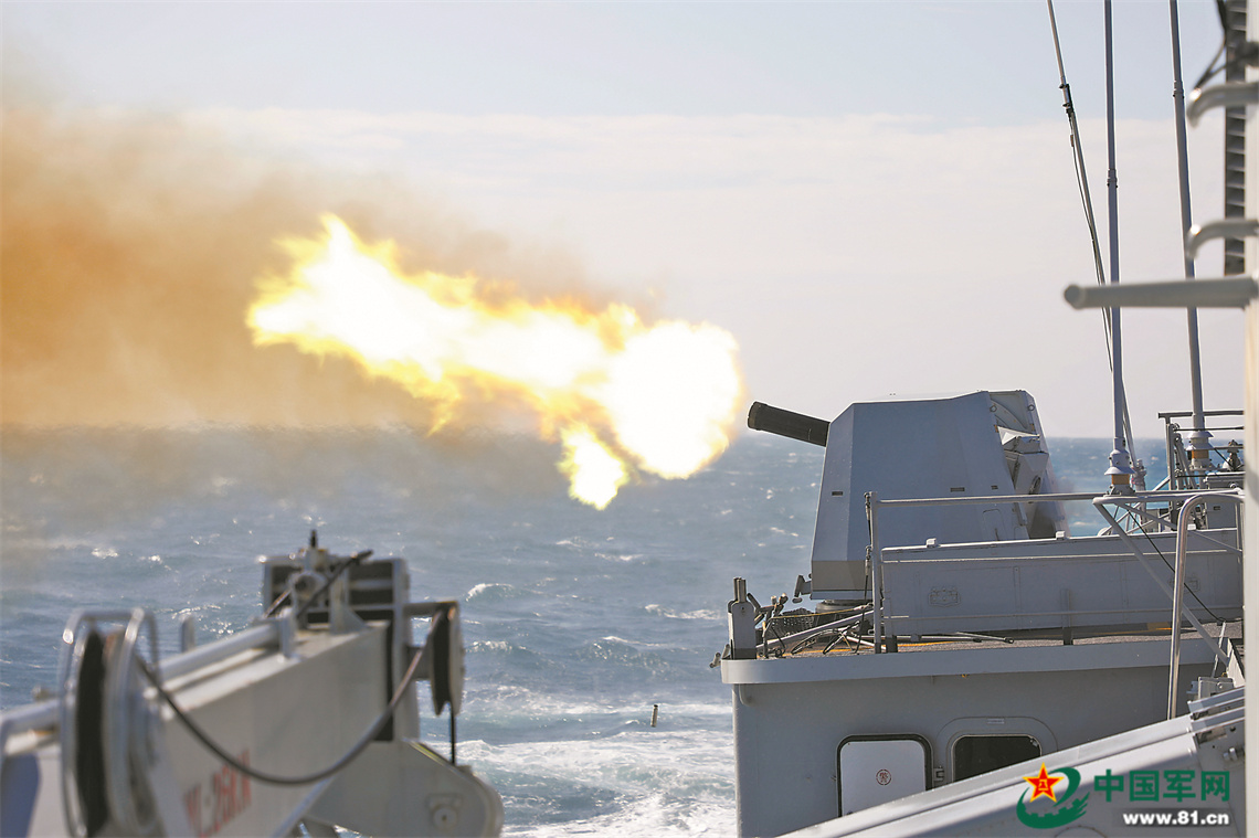 目标临近,官兵果断施放干扰弹。同时,舰艇各武备系统火力全开。一时间,海天之间炮声隆隆,硝烟弥漫。