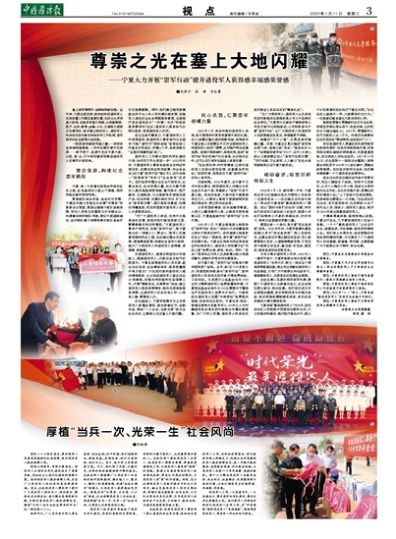 从军报国获尊崇,征衣虽解受尊重。从贺兰山麓到黄河之滨,从银吴平原到南部山区,宁夏座座城市的“崇军行动”火热开展。
