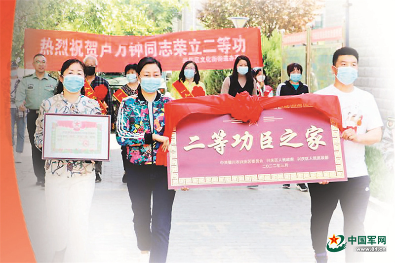 宁夏银川市兴庆区军地领导为荣立二等功的现役军人卢万钟家送立功牌匾和喜报。张国勤摄